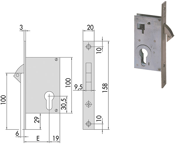 Serrature per montanti. 1 mandata. Gancio a mandata in acciaio lamellare nichelato. Contropiastra piana in acciaio con rivestimento in zinco. Predisposte per cilindro profilo europeo.