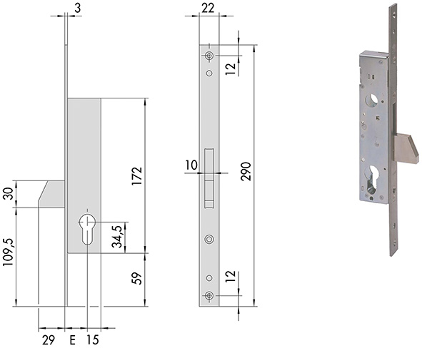 Serrature per montanti. 1 mandata. Catenaccio BASCULANTE. Reversibile. Frontale in acciaio INOX. Predisposte per cilindro profilo europeo. Contropiastra non compresa.