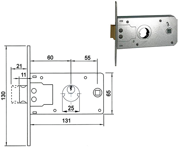 Serrature da infilare per fasce. Reversibile. Da abbinare a cilindro doppio tondo scanalato d.mm.25 ns.cod.839387 (non incluso). 1 mandata e scrocco. Frontale in acciaio zincato mm.18x108. Quadro maniglia mm.8. Interasse maniglia-cilindro mm.55.