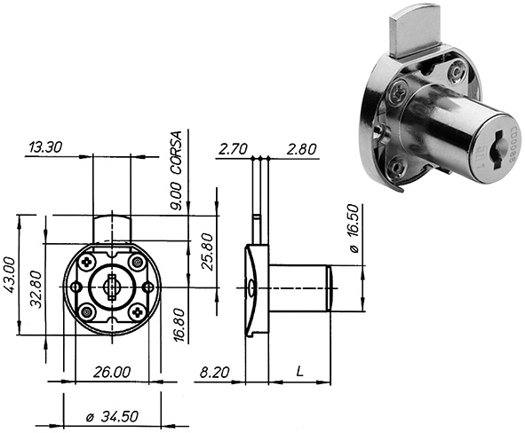Serratura da applicare per cassetti. Rotazione 180? (2 uscite chiave). Scatola in zama nichelata. Entrata E mm.16,8. Corsa mm.9. Due chiavi in dotazione. Chiave grezza ricambio ns.cod.849522. Possibilit? di avere chiave MAESTRA ns.cod.849523. Modificabili in KA con ns.cod.849180-81.
