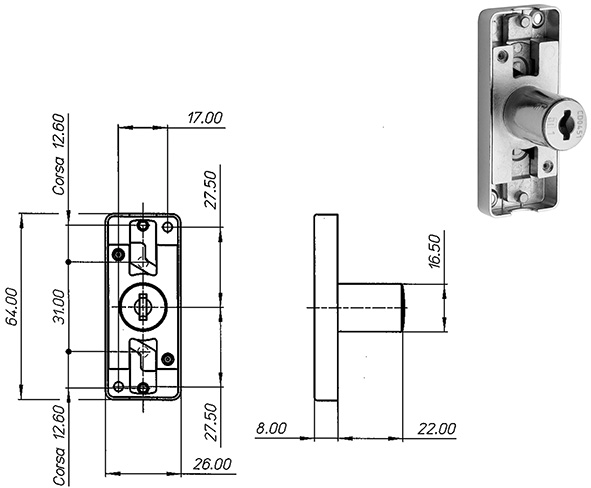 Serratura ad aste traslanti. Nichelata. Cilindro d.mm.16,5. Rotazione 90?+90?(2 uscite chiave). Due chiavi in dotazione. Chiave grezza ricambio ns.cod.849522. Possibilit? di avere chiave MAESTRA ns.cod.849523. Modificabili in KA con ns.cod.849180-81.