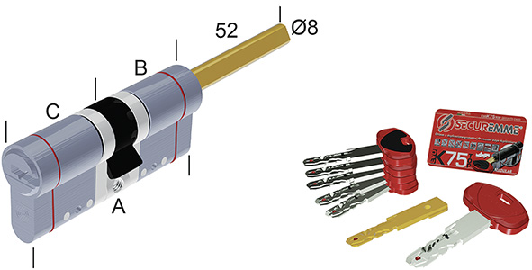 Cilindri modulari FRIZIONATI. Predisposti pomolo. 10 perni 1 elemento mobile e pista con 4 elementi mobili attivi. Antitrapano, antipicking e bumping. Rotore con spine anti estrazione. Sicurezza chiave classe 6. In dotazione tessera, 5 chiavi padronali, 1 cantiere, 1 chiave cambio. Chiavi a duplicazione PROTETTA presso i centri Team Securemme. Duplicato chiave in aggiunta ns.cod.862196.