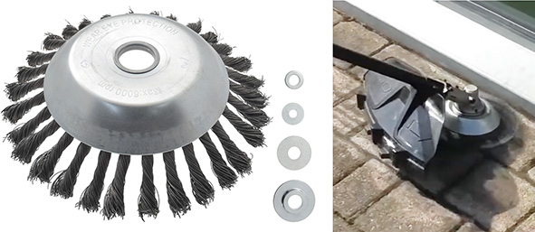 Spazzola pulitrice in acciaio per decespugliatori. Attacco universale. Diametro mm.200. Setole in acciaio per la pulizia degli interstizi tra gli autobloccanti ed il pav?. In dotazione kit adattatori e attacco tipo STIHL (d.mm.20).