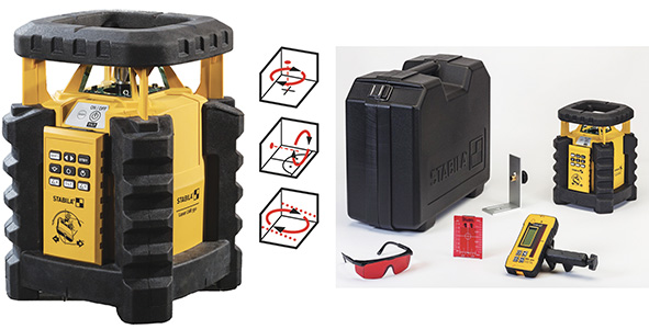 Laser rotante automatico a due assi con funzione d'inclinazione +/-5 gradi. Autolivellante. Laser rosso. Estremamente robusto con sistema Stabila Protector. Campo operativo diametro max 800mt. Precisione 0,1 mm/mt. Laser classe 2. IP65. In dotazione: ricevitore REC 300 Digital, telecomando RC-LAR350, staffa angolare 90?, occhiali, piastra riflettente, valigetta, 2 batterie D, 4 batterie AA.