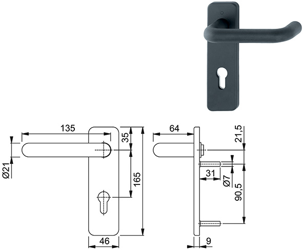 Mezza guarnitura tagliafuoco e uscita d'emergenza su placca. In resina. Certificata DIN 18273 e DIN EN179. Per porte spessore mm.45-70. Quadro mm.9. ANTIPANICO SDOPPIATO. Interasse mm.72.
