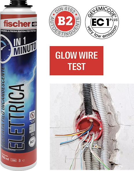 Adesivo poliuretanico a bassa espansione testato al filo incandescente GLOW WIRE TEST secondo i requisiti richiesti CEI 64-8. Per incollaggi rapidi di scatole elettriche e tubi corrugati, presa iniziale gi? dopo 60 secondi. Alta adesione a espansione controllata. Aderisce su materiali da costruzione: calcestruzzo, metalli, legno, lastre cartongesso, plastiche. Applicabile con pistola.