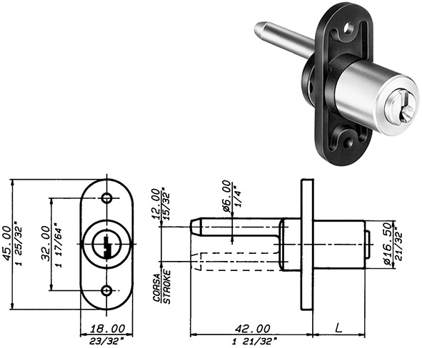 Serratura per chiusure multiple frontali. Flange di fissaggio VERTICALI, per applicazione su cassettiera. Cilindro a spine in ottone d.mm.16,5. Rotazione 360? (2 uscite chiave). Scatola in polimero nero. Due chiavi in dotazione. (Chiave ricambio ns.cod.880578).