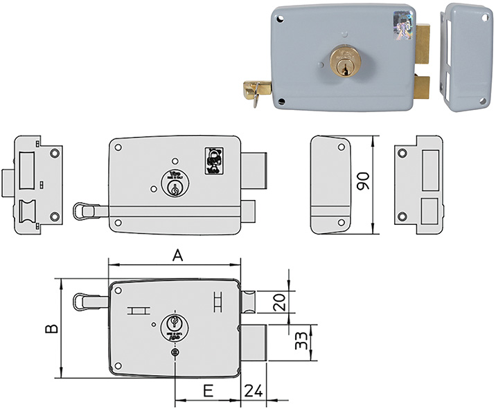 Per porte in legno. Due mandate e scrocco. Cilindro interno fisso e tirante laterale. Scrocco reversibile con possibilit? di esclusione. Con 3 chiavi art.015 ns.cod.840518. Chiave grezza ricambio ns.cod.880838.