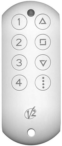 Per motori tapparelle V2. Trasmettitore 434,15 MHz con 4 canali. Funzione GLOBALE per trasmettere contemporaneamente il comando a tutti e 4 i canali. Occhiello per fissaggio al portachiavi. Supporto a parete in dotazione fissabile tramite adesivo (incluso) o predisposto per fissaggio a vite. Portata in campo libero mt.300. Alimentazione con 1 batteria 3V (CR2032). Dimensioni mm.38x92x12.