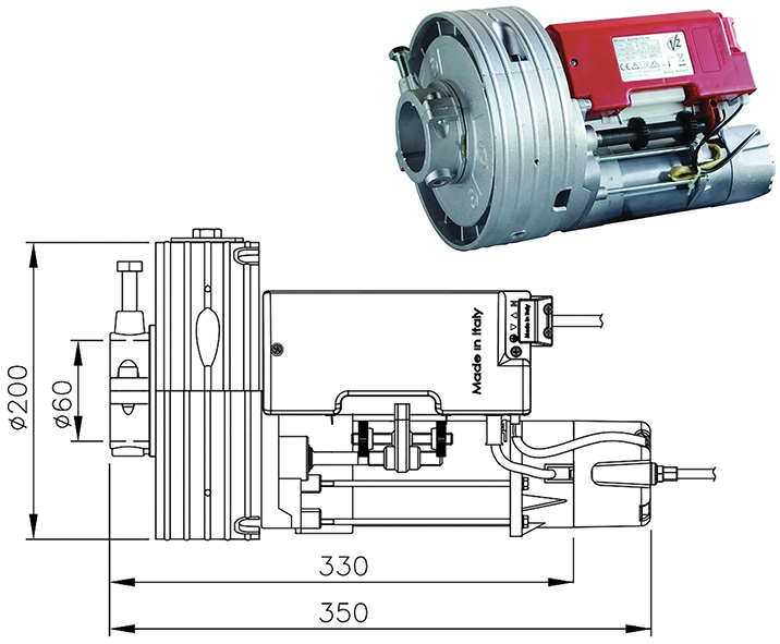 Attuatore elettromeccanico 230V irreversibile. Con ELETTROFRENO. Per serrande fino a kg.170. Potenza elettrica max 630W. Corrente assorbita 2,7A. Cablaggi protetti da contenitore plastico. Gruppo finecorsa esterno facilmente accessibile. Regolazione finecorsa. Condensatore precablato. In dotazione: adattatore albero d.mm.60/48, adattatore corona d.mm.200/220. Made in Italy.
