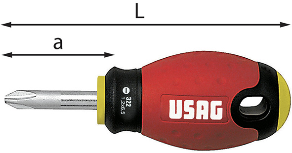 Modello corto. Per viti con impronta a croce PHILLIPS. Impugnatura ergonomica bimateriale. Lama in acciaio al Cromo Vanadio. Esecuzione cromata con punta sabbiata. ISO 8764.
