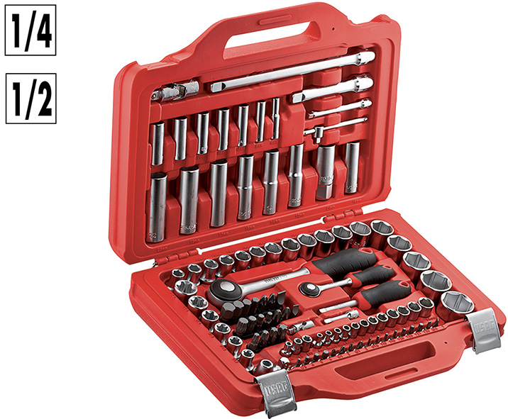 Cassetta modulare: 19pz chiavi a bussola 1/4 esagonali, 3pz 1/4 torx, 17pz 1/4 con inserto PH/PZ/taglio/esagonale/torx, 2pz prolunghe 1/4, snodo cardanico 1/4, leva a T 1/4, portabussole 1/4, cricchetto 1/4; 23pz chiavi a bussola 1/2 esagonali, 6pz 1/2 torx, 2pz 1/2 x candele, 2pz prolunghe 1/2, snodo cardanico 1/2, cricchetto 1/2, riduttore 1/2-3/8, portainserti 1/2-5/16, 18pz inserti 5/16.