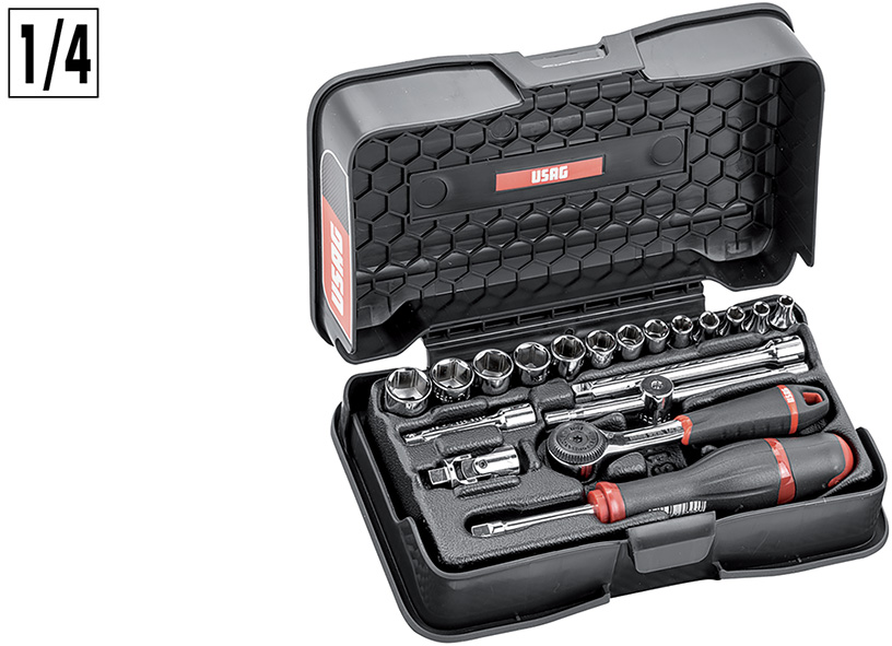 Cassetta in ABS con sistema di chiusura rapida. Il modulo interno ? studiato per essere modulare con i cassetti dei carrelli. Contenuto: 13pz chiavi a bussola 1/4 esagonali mm.4-4,5-5-5,5-6-7-8-9-10-11-12-13-14, 2pz prolunghe 1/4 mm.50-100, cricchetto reversibile 1/4 certificato IP51, leva a T 1/4 attacco quadro scorrevole, snodo cardanico 1/4, portabussole 1/4 con impugnatura.