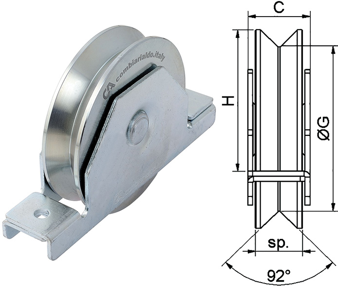 Ruota 2 cuscinetti gola V supporto interno. Zincata. Per cancelli scorrevoli.