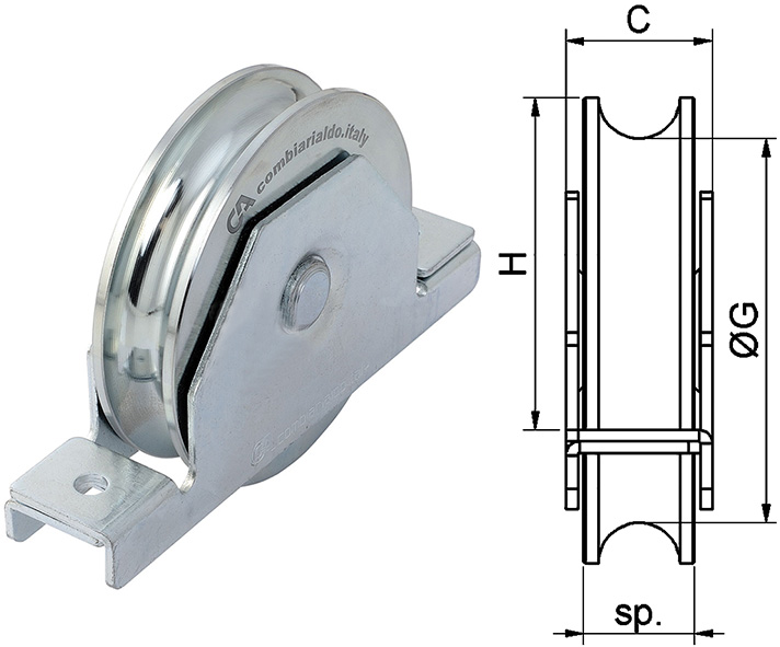 Ruota 2 cuscinetti gola TONDA supporto interno. Zincata. Per cancelli scorrevoli.