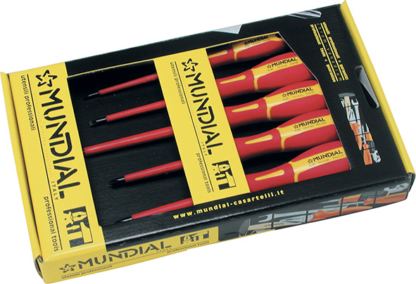 Cacciaviti isolati 1000V. Certificati VDE - EN 60900. Impugnatura morbida bicomponente. Acciaio Chrom Vanadium, finitura punta nera. Serie pz.5: TAGLIO 3x0,5x100 - 4x0,8x100 - 5,5x1x125, PHILLIPS 1x100-2x100.