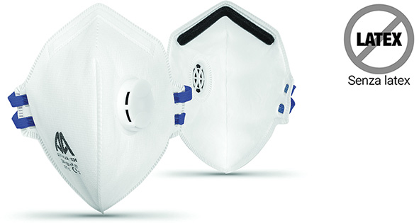 Maschere pieghevoli con valvola di espirazione in polipropilene con membrana in gomma termoplastica priva di lattice. EN 149:2001+A1:2009 classe FFP2 NR. DPI III categoria CE. Confezionate in busta singola.