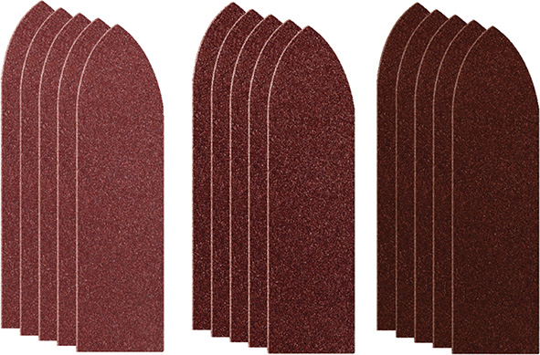 Carta abrasiva in fogli con attacco in velcro e profilo a dito mm.87x32. Serie pz.15 composto da: pz.5 grana 60, pz.5 grana 120, pz.5 grana 180. Per levigatrici orbitali SKIL ns.cod.274879.