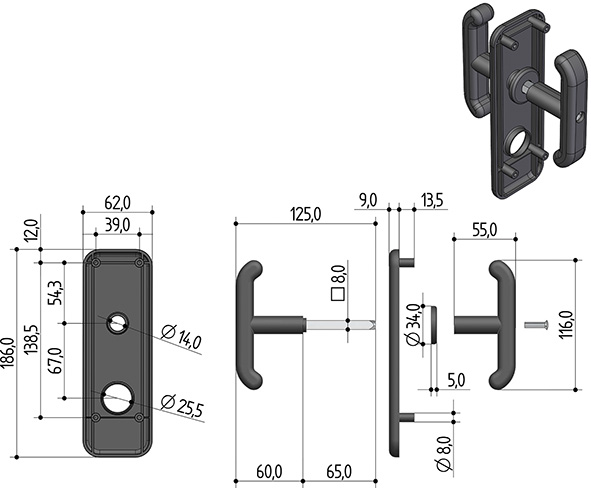 Kit maniglie per basculanti con placca. Foro cilindro tondo. Quadro maniglia mm.8. In plastica nera. Per serrature Prefer art.B551 ns.cod.842010, art.8651 ns.cod.842029, art.W551 ns.cod.842008.
