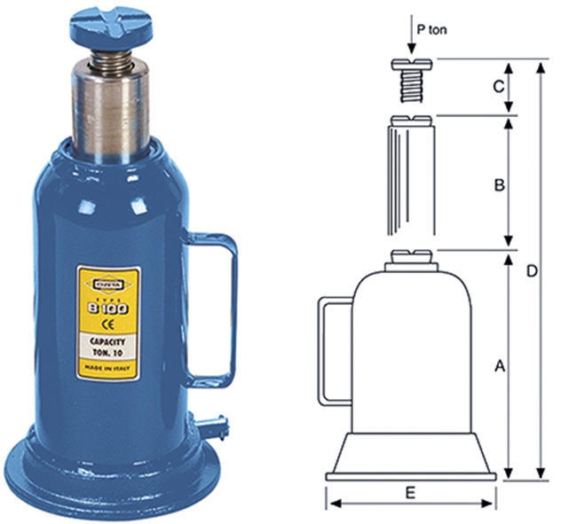 A un pistone con vite di rialzo. Usare olio Sae 30. A = altezza minima. B = corsa pistone. C = prolunga vite. D = altezza massima. N.B. Il tipo da 30 quintali non ha la vite di prolunga.
