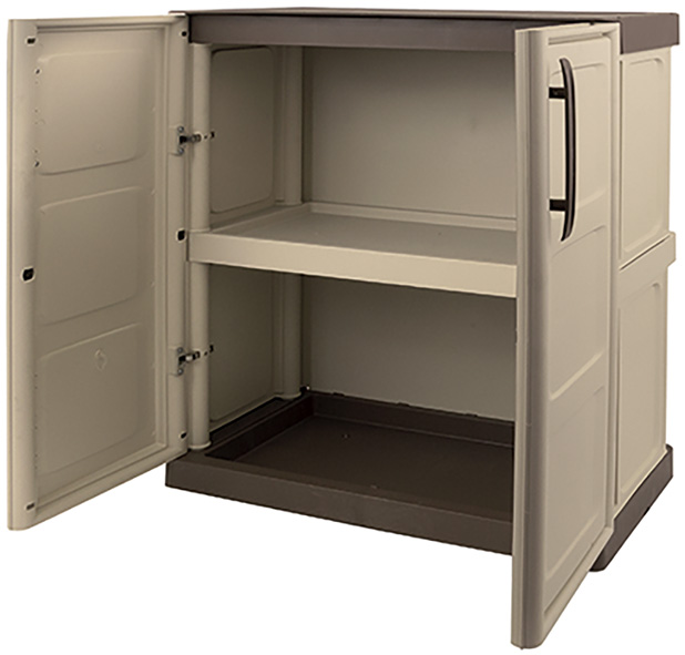 2 ripiani altezza fissa. In robusto polipropilene antiurto, resistente al freddo, alle intemperie, agli oli e ai solventi. Sistema anti-usura con cerniere in acciaio, chiusura a scatto. Maniglie verticali per una comoda presa. Semplice sistema di montaggio. Prodotto italiano ecosostenibile.