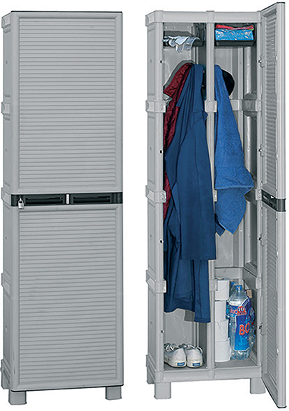 Armadio per SPORCO/PULITO. In robusto polipropilene antiurto, resistente al freddo, alle intemperie, agli oli e ai solventi. Sistema anti-usura con cerniere in acciaio. Maniglie orizzontali. Chiusura con lucchetto. Semplice sistema di montaggio. Prodotto italiano ecosostenibile.