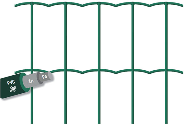 Rete elettrosaldata zincata e plasticata in PVC verde. Fili orizzontali ondulati per rendere pi? agevole la posa in opera. Elegante e armoniosa, questa rete trova il suo impiego ideale nella recinzione di ville e giardini, ma si presta anche per grandi aree come parchi, industrie e complessi residenziali. Rotoli mtl.25.