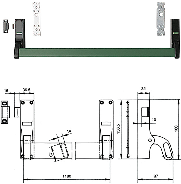 Reversibili. Supporti in alluminio verniciato nero, scrocco in zama nichelata, barra orizzontale in acciaio verniciato a polvere di colore verde. Larghezza max della porta mm.1240. Confezione: scatola di 1 maniglione antipanico completo montato sinistro.