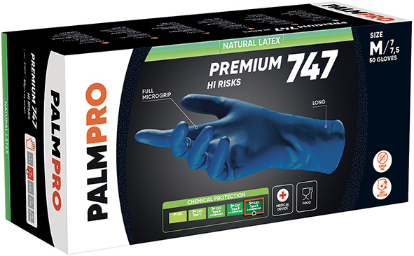 III categoria di rischio. Guanti ad alta resistenza monouso non sterile. In lattice naturale sottoposto a processo di clorinazione e successivo lavaggio, quindi a ridottissimo contenuto proteico. Colore blu. Ambidestri con bordino. Senza polvere. Finitura interna opaca ed esterna microruvida. Lunghezza mm.300. Spessore mm.0,30. Peso 19,0g. Idonei per alimenti. AQL<1.5. Conf.50 pz. =25 paia.