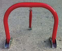Sbarramento posteggio auto in tubo d'acciaio d.mm.40 verniciato rosso. Piastre di fissaggio in acciaio zincato con fori per lucchetto (lucchettabile con ns.cod.519644 da ordinare a parte). Barra centrale. Larghezza cm.55. Altezza cm.45.