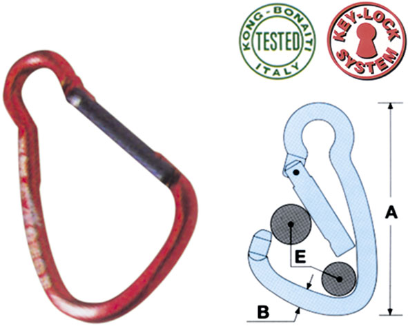 KEY-LOCK SISTEM l'unica chiusura senza impigli. Questo sistema di chiusura brevettato trae il suo nome dalla forma dell'incastro tra la leva ed il corpo del moschettone. E' stato eliminato qualsiasi dente di tenuta sia sul corpo del moschettone che sulla leva, ora completamente cilindrica. Non esiste pi? alcun punto di possibile impiglio della corda durante l'inserimento e lo sgancio.