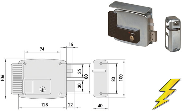 Per cancelli. Due mandate e scrocco autobloccante. Con tettuccio art.07061.00. In dotazione bocchetta art.07020.00. Coppia cilindri art.02145.00 ns.cod.837653. Con 3 chiavi art.01310.00.1 ns.cod.837690. Chiave grezza ricambio ns.cod.880392.