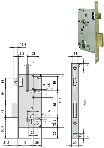 Serrature per porte in legno. Bordo QUADRO. 2 mandate. Fori per il montaggio di borchie di protezione a viti passanti. Frontale smontabile e contropiastra in acciaio ottonato. Scrocco reversibile biconico. Catenaccio a due mandate. Predisposte per cilindro profilo europeo.