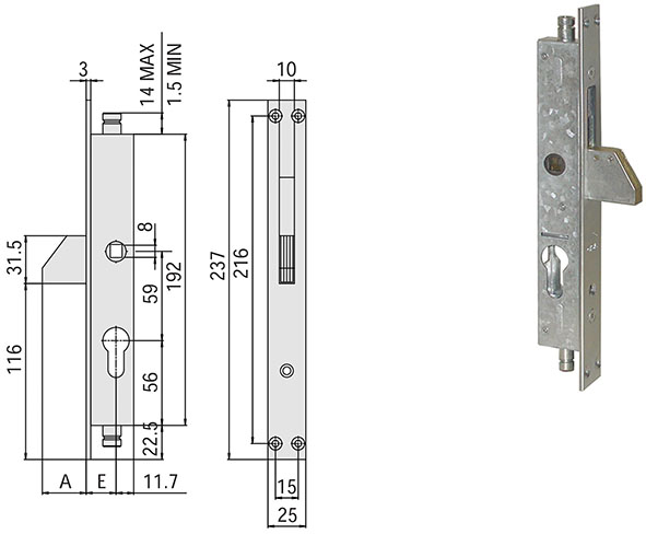 Serrature per persiane e inferriate. Catenaccio in acciaio. 1 mandata. Quadro maniglia mm.8 per l'azionamento del catenaccio e dei rinvii, bloccabile con chiave. Senza cilindro: monta cilindri europei con camma speciale girata di 90? art.0G303.07 ns.cod.837427 e art.0G305.02 ns.cod.837428. N.B. se necessario abbinare a maniglia art.06003.00 ns.cod.837425 e kit aste art.07088.03 ns.cod.837423.