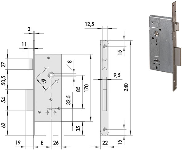Serrature per legno infilare doppia mappa. 2 MANDATE. Catenaccio e scrocco reversibile. Reversibile. Frontale e contropiastra nichelati. Quadro maniglia passante mm.8. Contropiastra 06278.00 compresa. Con 3 chiavi art.00100.00.1 ns.cod.837905 (chiave grezza ricambio ns.cod.853580).