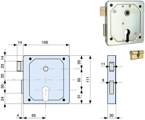 Serrature da applicare quadre tipo Torino per cancelletti. 2 mandate e scrocco reversibile. Catenacci in ottone. Quadro maniglia mm.8. In dotazione cilindro profilo europeo MG 015560 ns.cod.839240.