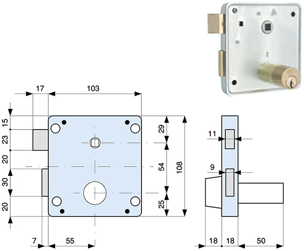 Serrature da applicare quadre tipo Torino per cancelletti. 2 mandate e scrocco reversibile. Catenacci in ottone. Quadro maniglia mm.8. In dotazione coppia cilindri tondi fissi MG 014500 ns.cod.839230.