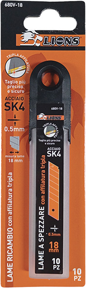 Lame a spezzare 7 elementi in acciaio SK4 con tripla affilatura laser. Spessore mm.0,5. Confezione blister astuccio 10 lame.