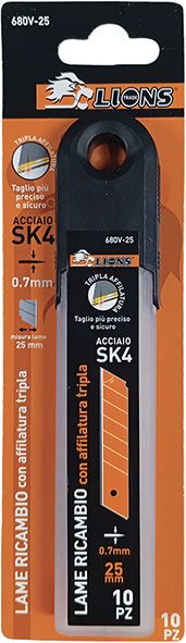 Lame a spezzare 7 elementi in acciaio SK4 con tripla affilatura laser. Spessore mm.0,7. Confezione blister astuccio 10 lame.