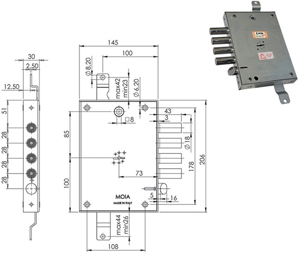Serratura reversibile triplice doppia mappa per porte blindate. 4 mandate e scrocco reversibile. Piastra antitrapano interna. Sistema anti decodifica della chiave. 3 chiavi. Mostrine e aste non compresi. Serie AD, M. COMPATIBILE ATRA/DIERRE MOTTURA.