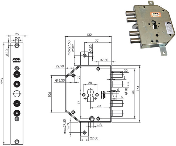 Serratura triplice per porte blindate. 2 mandate e scrocco reversibile. Per cilindro europeo. Fissaggio cilindro con porta cilindro e blocco antieffrazione. Cilindro, mostrine e aste non compresi. Serie C. Defender interasse mm.38 viti M6. COMPATIBILE CIERRE.