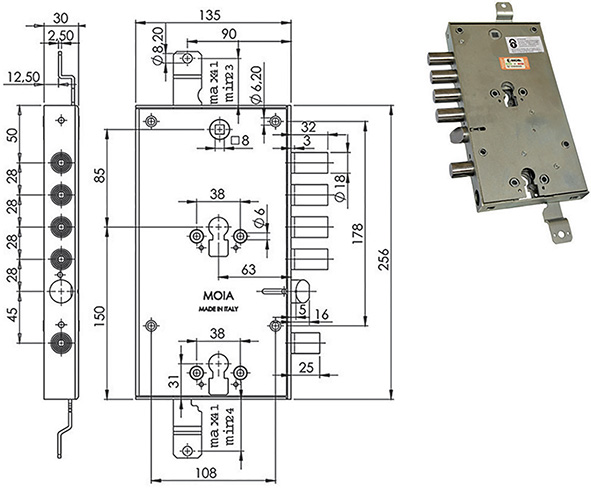 Serratura reversibile triplice AD INGRANAGGI per porte blindate. Doppio meccanismo per cilindro europeo. 2 mandate e scrocco reversibile + 1 chiusura di servizio. Piastra antitrapano interna. Fissaggio cilindro con porta cilindro e blocco antieffrazione. Cilindri, mostrine e aste non compresi. Serie M. Defender interasse mm.38 viti M6. COMPATIBILE MOTTURA.
