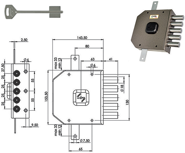 Serratura doppia mappa ad applicare. Triplice. 4 mandate. Piastra antitrapano interna. Sistema anti decodifica della chiave. 3 chiavi. Mostrine e aste non compresi. COMPATIBILE MOTTURA.
