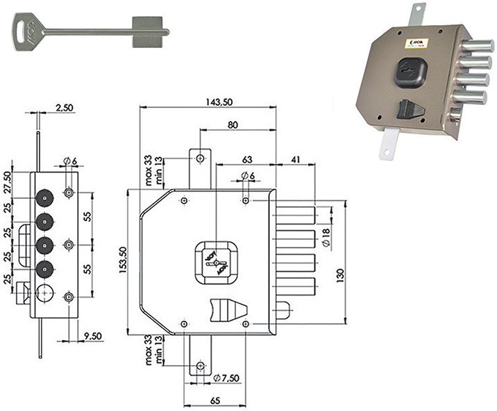 Serratura doppia mappa ad applicare. Triplice. 4 mandate e scrocco reversibile. Piastra antitrapano interna. Sistema anti decodifica della chiave. 3 chiavi. Mostrine e aste non compresi. COMPATIBILE MOTTURA.