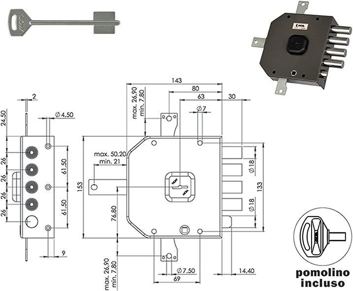 Serratura doppia mappa ad applicare. Quintuplice. 4 mandate e scrocco reversibile. Piastra antitrapano interna. Sistema anti decodifica della chiave. 3 chiavi. Aste e deviatore non compresi. COMPATIBILE AUNO ANTONIOLI.