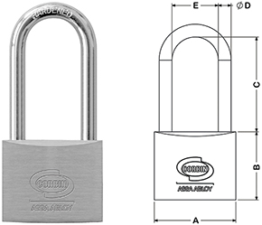 A prova di corrosione. Arco lungo. Corpo e arco in ottone cromato lucido. Protezione meccanismi interni con anello in gomma sull'arco. 2 chiavi. Doppio scrocco di bloccaggio per misura 40. Chiave grezza ricambio: mm.30/ns.cod.880060, mm.40/ns.cod.880058.