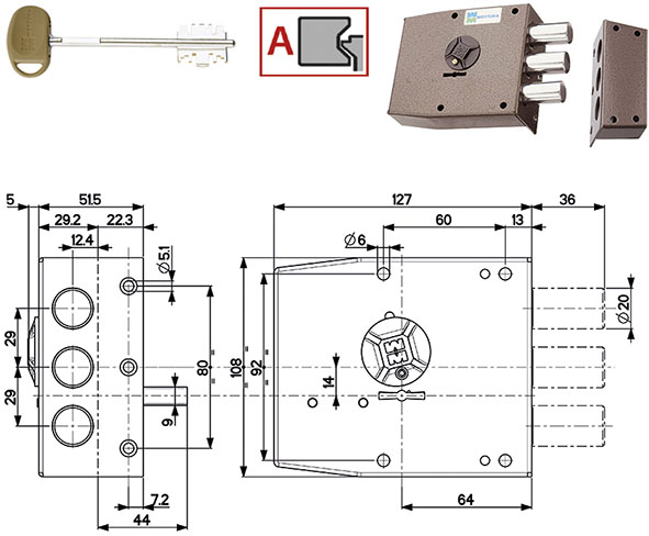 Serratura doppia mappa ANTIDECODUE da applicare verniciata. Laterale con 3 catenacci. Entrata 63. 4 mandate. Corsa catenacci mm.36. Apertura interna ed esterna con chiave. Con 3 chiavi (92106/4). Figura mano Dx.