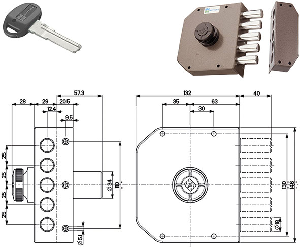 Serratura da applicare verniciata. Laterale con 5 catenacci. Entrata 63. Corsa catenacci mm.40. Apertura interna con pomolo. Esterno cilindro C10 L mm.50 con 3 chiavi (92C10B0). Figura mano Dx.