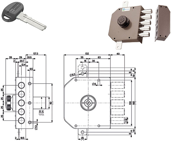Serratura da applicare verniciata. Triplice con 5 catenacci. Entrata 63. Corsa catenacci mm.40. Apertura interna con pomolo. Esterno cilindro C10 L mm.50 con 3 chiavi (92C10B0). Senza aste (93140). Figura mano Dx.