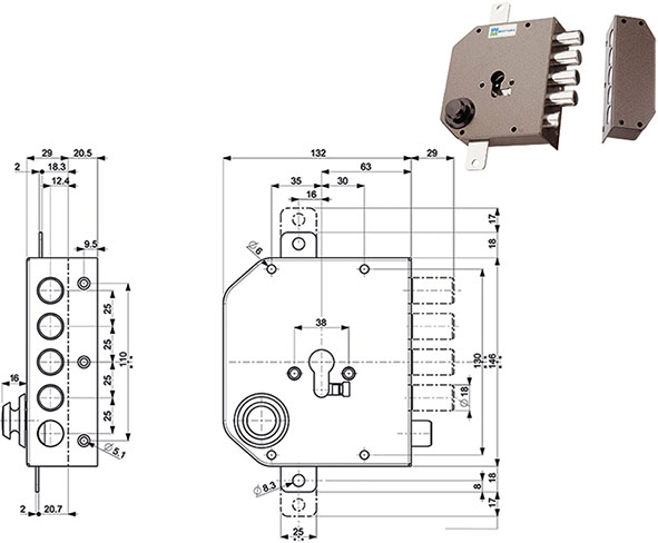 Serratura per cilindro europeo, da applicare verniciata. Triplice con 4 catenacci e scrocco. Entrata 63. Corsa catenacci mm.30. Apertura interna ed esterna con cilindro non in dotazione, da ordinare a parte. Senza aste (93140). Figura mano Dx.